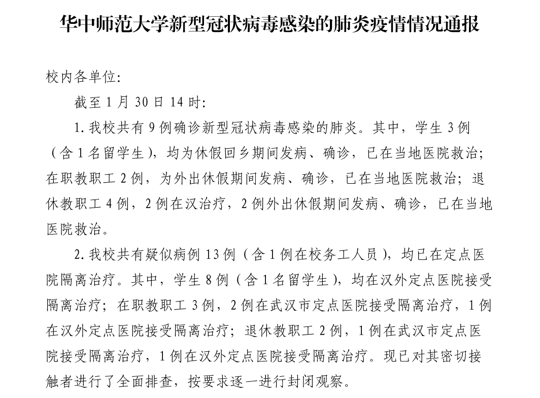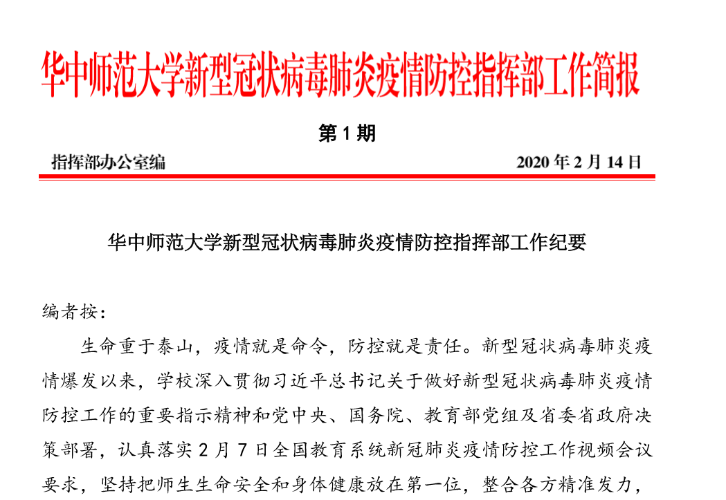 《关于推迟2020年部分特殊类型招生考试工作的公告》(1月27日) 《华中师范大学2020年春季开学准备工作预通知方案》(1月31日) 《2020年春季学期本科生延期开学返校及教学工作的安排》(2月2日) 《华中师范大学关于疫情防控时期师生员工返校及返校后的行为管理规定》(2月4日) 《华中师范大学关于严明疫情防控期间教职工返校“四个严禁”纪律要求的通知》(2月4日) 《华中师范大学疫情防控期间学生返校及返校后行为管理方法》(2月4日)《华中师范大学国际学生疫情防控期间管理办法》(2月4日) 《关于新冠肺炎疫情防控期间开展科研工作的指导意见》(2月5日) 《关于遵守网上教学工作规范 共建良好教学秩序的倡议》(2月10日) 《特殊类型学生招生方案》(2月14日) 《学校2020年硕士研究生成绩公布和成绩复查工作方案》(2月21日) 《学校2020年硕士研究生招生计划编报方案》(2月21日) 《疫情防控背景下学校就业工作应对方案》(2月21日) 《关于做好教职工有序返校到岗工作的通知》(4月10日) |