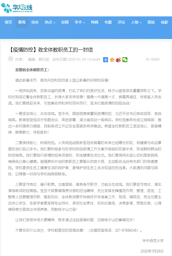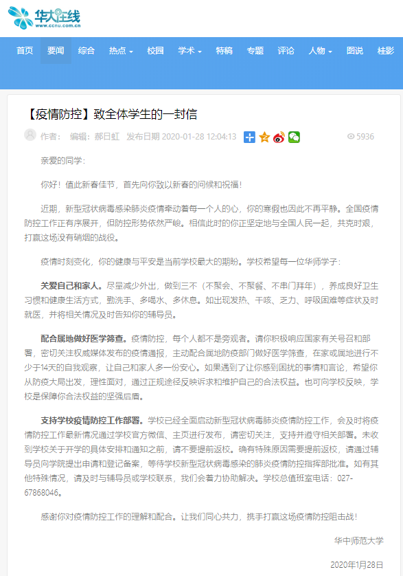 1月24日,华中师范大学正式启动向教育部、教育厅疫情动态数据一日一报,建立学生辅导员、班主任或专业教师、研究生导师协同的一对一联系学生制度,做到“学生的基本信息、健康状况、工作台账”等三个方面的精准。