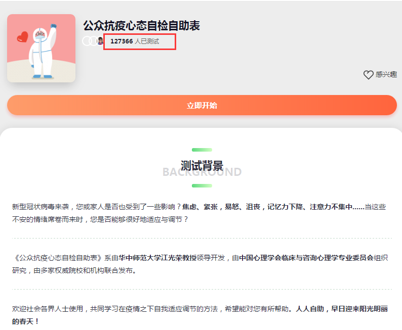 开发“公众抗疫心态自检自助表”工具,超过10万人使用
