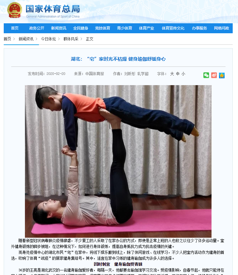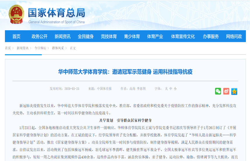 国家体育总局报道我校体育学院“邀请冠军示范健身 运用科技指导抗疫”