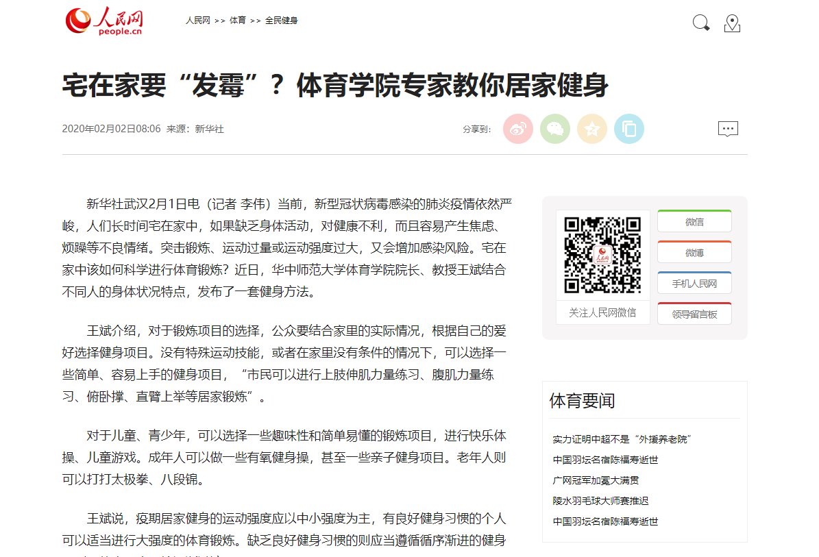 人民网 《宅在家要“发霉”?体育学院专家教你居家健身》