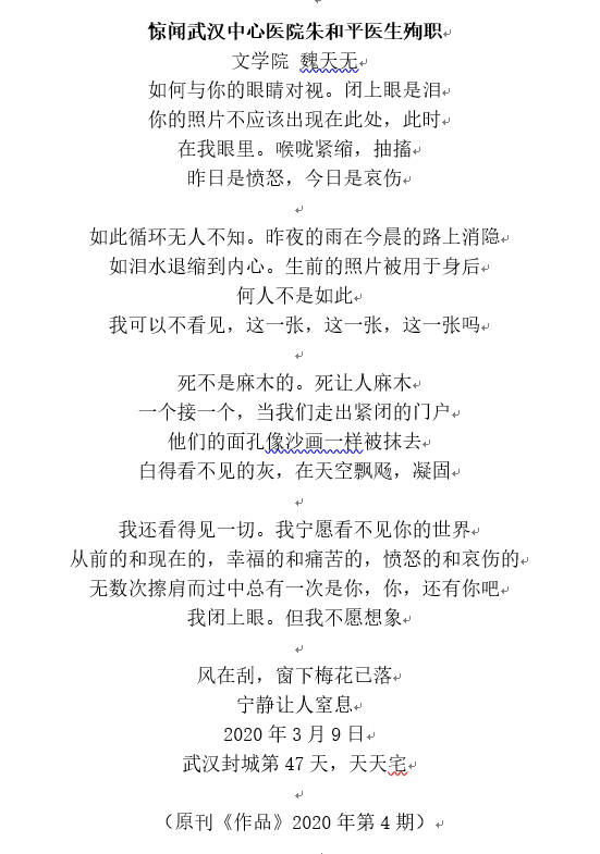 魏天无老师 《惊闻武汉中心医院朱和平医生殉职》