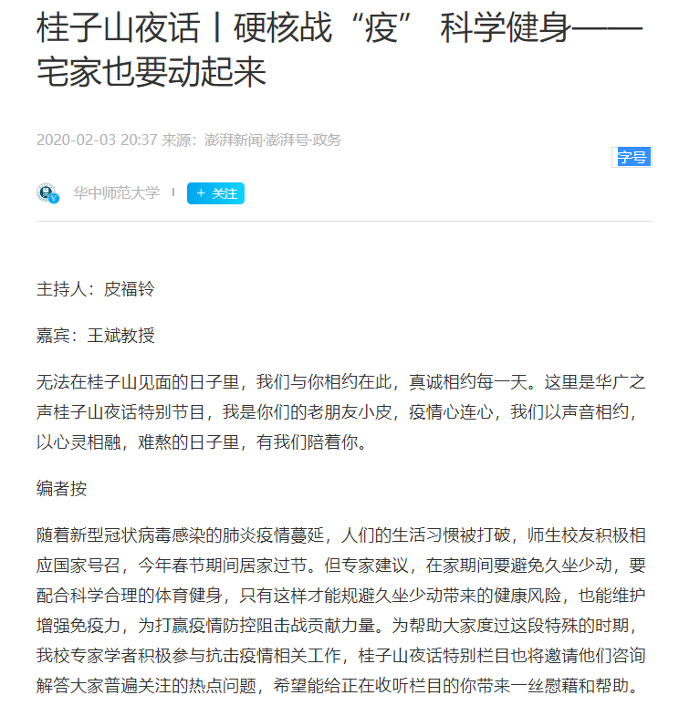 “桂子山夜话”节目《硬核战“疫”科学健身——宅家也要动起来》被澎湃网等媒体转载,并被学习强国平台收录