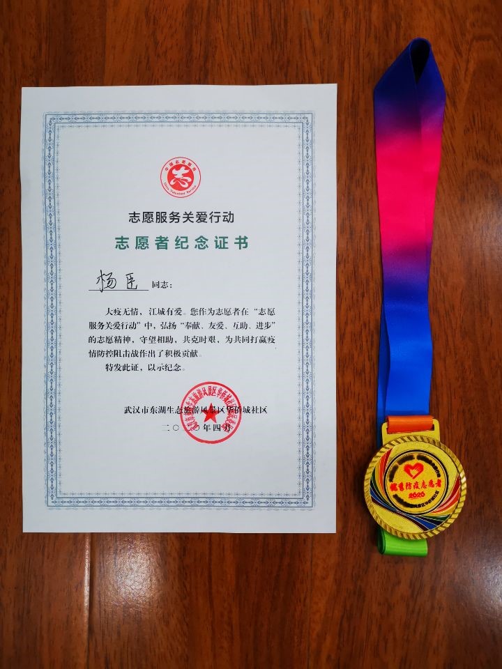 谢放同学参加雷神山志愿服务的纪念册与纪念章